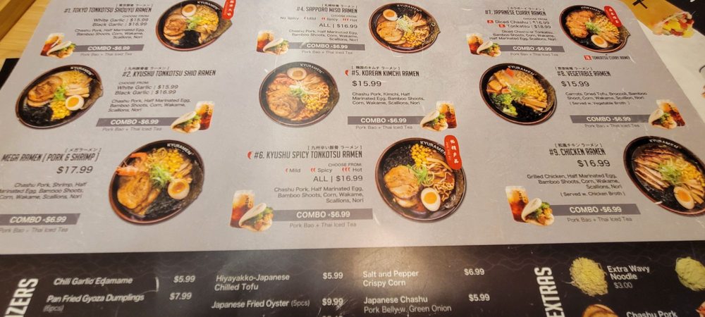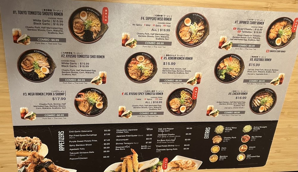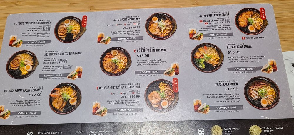 Kyuramen - Suwanee, a ramen and Asian fusion restaurant located in Suwanee, GA, offers a unique dining experience with a focus on ramen dishes. Customers have praised the standout ramen options, including the spicy ramen with flavorful broth and generous portions. The atmosphere is described as trendy and cute, with the option for outdoor seating. The menu also includes a variety of appetizers, bubble teas, and unique desserts like Matcha Pudding with Red Bean. Prices are reasonable, with combos that include drinks and desserts for under $25. Overall, Kyuramen - Suwanee has impressed customers with its food quality, friendly staff, and stylish ambiance, making it a go-to spot for ramen enthusiasts and those looking for a memorable dining experience.